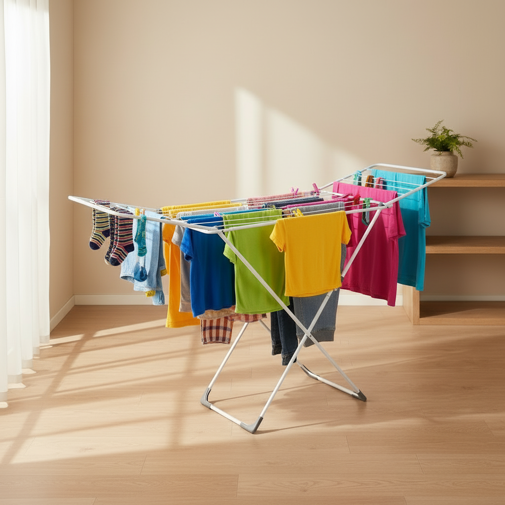هيكل قوي ومستقر - إطار قوي يحمل الغسيل الثقيل الرطب دون أن ينقلب أو يتأرجح، مما يضمن تجفيفًا آمنًا وفعالًا